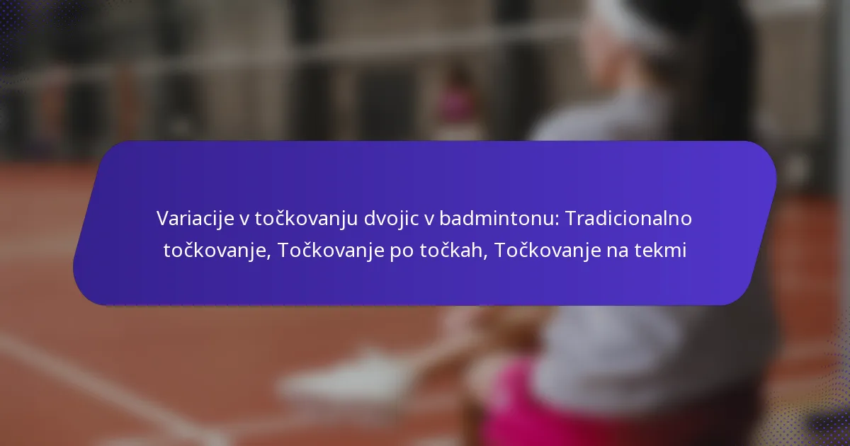 V dvojicah badminton vključuje več različic točkovanja, vključno s tradicionalnim točkovanjem, točkovanjem po rallyju in točkovanjem na tekmi, pri čemer ima vsaka različica svoje posebne pravila, ki oblikujejo igro in strategijo. Tradicionalno točkovanje omogoča, da točke zasluži le ekipa, ki servira, medtem ko točkovanje po rallyju omogoča obema ekipama, da dosežejo točke ob vsakem servisu, kar spodbuja hitrejšo igro. Razumevanje teh metod točkovanja je ključno za igralce, da prilagodijo svoje strategije in izboljšajo svoje predstave na igrišču.